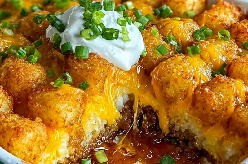 Step 8: Bake in the preheated oven for 30-35 minutes, or until the cheese is bubbly and the tater tots are golden brown.